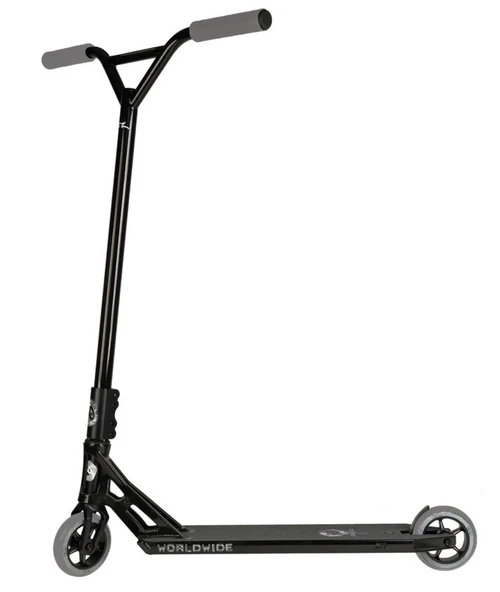 The Worldwide is probably the most modern street scooter on the market today and has all bells and whistles. The all flat deck is 5.8” wide, 22” long, comes with all flat front, 84 degree headtube angle, Pentacle 115 x 30 mm wheels, Chromoly V-bar (27 x 24.5”), SCS clamp and our Pentacle alum fork. The savings are significant over putting a scooter together from custom parts. AO also offers plugs to square out the dropouts, if desired (sold separately). 1 year warranty against failure in material and workmanship.