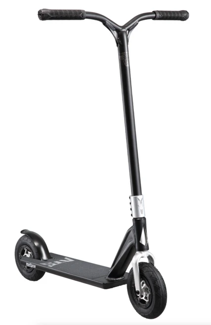 The all new Envy ATS Dirt Scooter Complete features light-weight aluminum hardware and a unique cut-out deck design making this the lightest all-terrain scooter at only 10.9 lbs. Included in this complete package is the ultra-light Bull Bar (weighing in at only 1.9 lbs) engineered from high density aluminum and comes with FREE TPR Handgrips. Its all-terrain pneumatic tires with tread come in at 200 x 50mm and enforced with an aluminum spoked core meaning you can take this bad-boy anywhere with you. The deck is engineered with 6061-T6 Aluminum with an 84° head tube angle giving you the smoothest ride over the toughest of terrain. Lastly the ATS is reinforced with a 6061-T6 All Terrain Aluminum Fork and wrapped in the classic 4 Bolt Omen SCS Clamp.