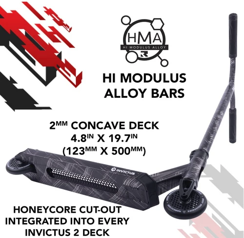 - Durable, reinforced Invictus 2 deck featuring a Honey-core cut-out top deck plate – 500mm (19.68″) long x 123m (4.84″) wide